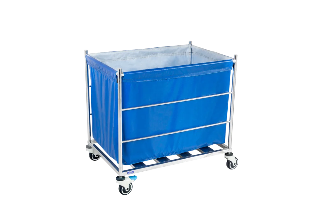 ترالی بین مستطیل ST79 با بدنه استیل ضدزنگ و کاور برزنتی آبی رنگ، مخصوص حمل رختهای آلوده در بیمارستان، کلینیک و مراکز درمانی. دارای چرخ ترمزدار صنعتی، ساختار مقاوم، ظرفیت بالا و مناسب رختشویخانه.
