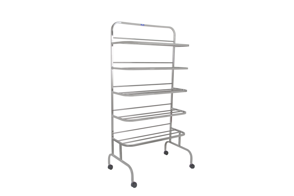 جاکفشی چرخدار استیل پیشگامان راه طب، طراحی شده برای نگهداری منظم و ایمن کفشها در محیطهای بیمارستانی و صنعتی. مجهز به پنج طبقه مقاوم و بدنه استنلس استیل گرید 304، قابلیت استفاده به صورت چرخدار یا نصب ثابت به دیوار را دارد.